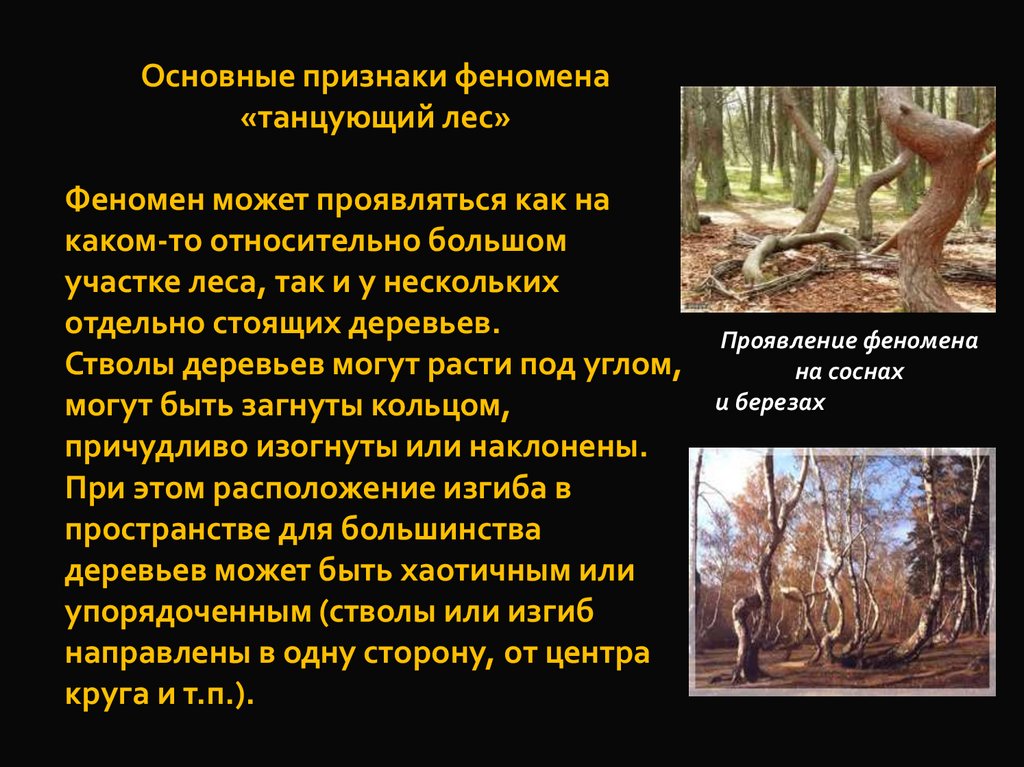 Основные признаки феномена«танцующий лес»