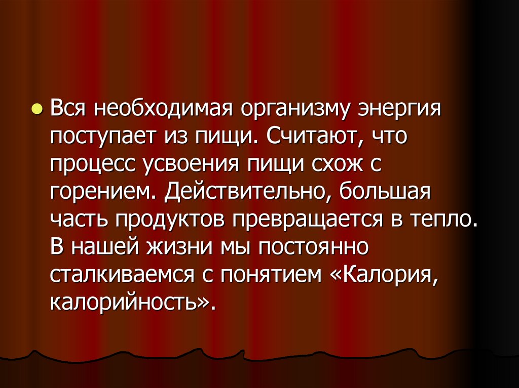 Вся необходимая организму энергияпоступает из пищи. Считают, что