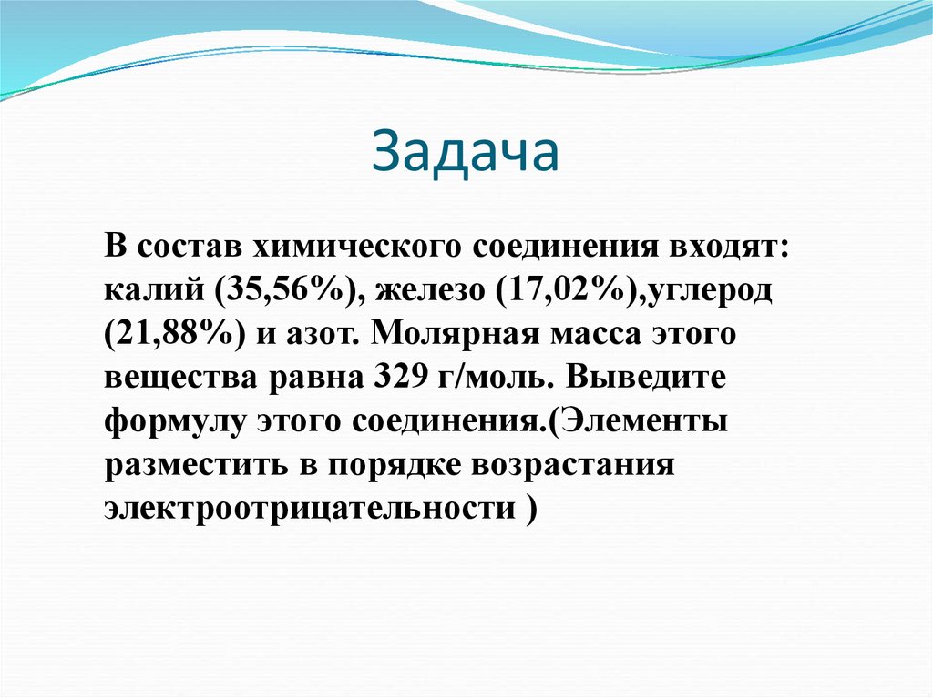 В состав химического соединения входят:калий (35,56%), железо (17,02%),углерод