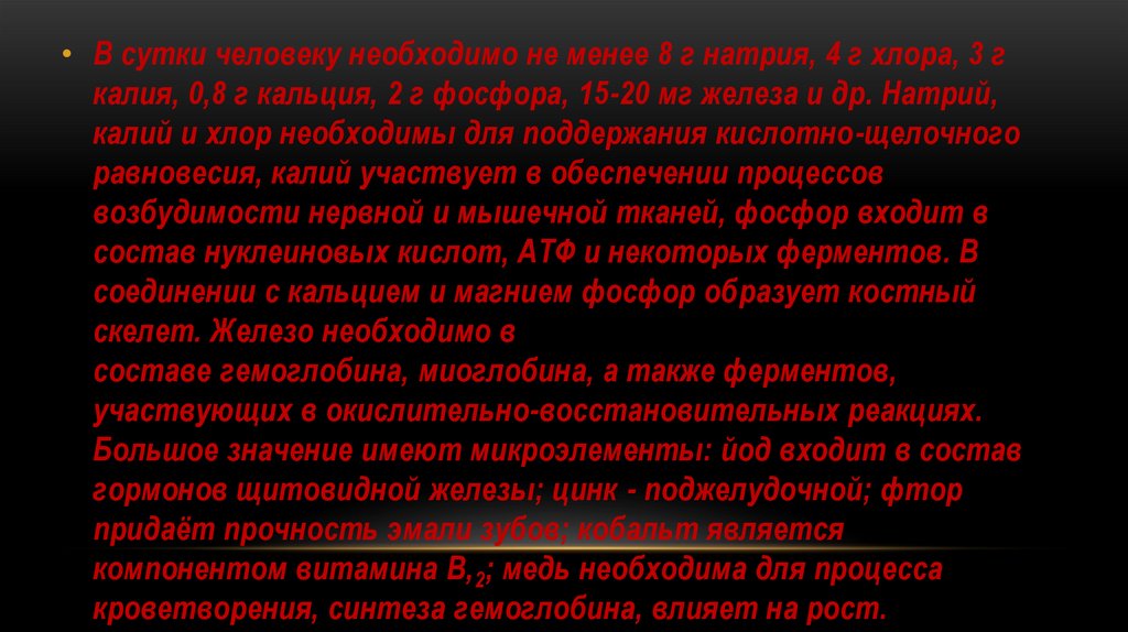 • В сутки человеку необходимо не менее 8 г натрия, 4 г хлора, 3 гкалия, 0,8 г кальция, 2 г фосфора, 15-20 мг железа и др. Натрий,