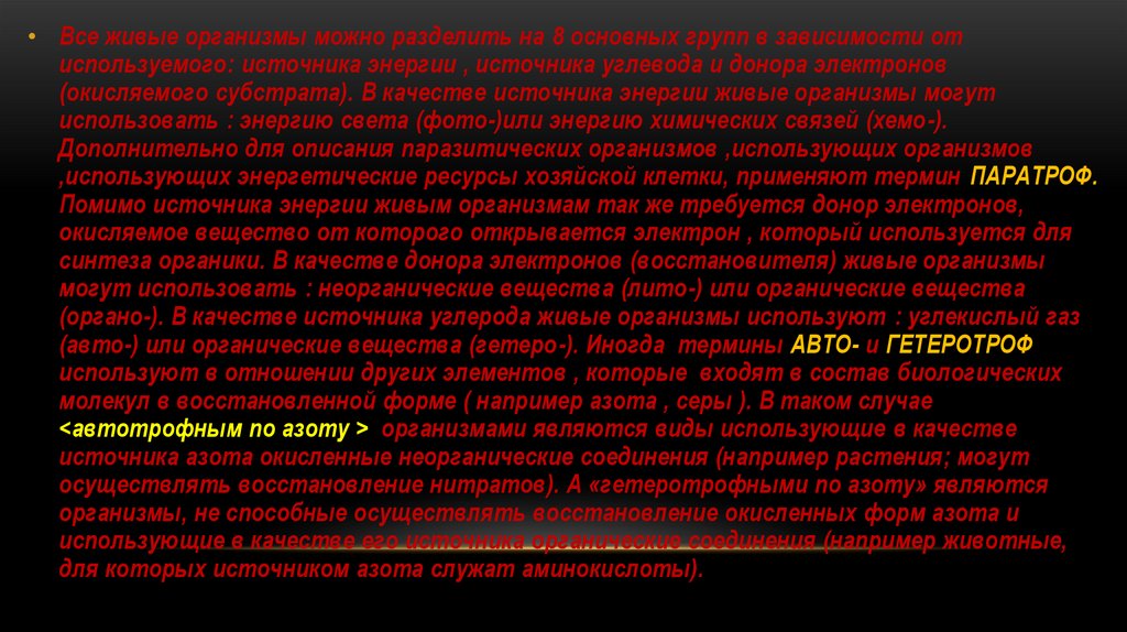 • Все живые организмы можно разделить на 8 основных групп в зависимости отиспользуемого: источника энергии , источника углевода и донора электронов