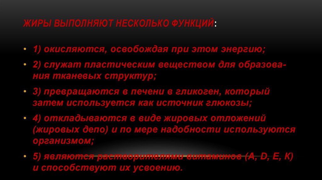 ЖИРЫ ВЫПОЛНЯЮТ НЕСКОЛЬКО ФУНКЦИЙ:• 1) окисляются, освобождая при этом энергию;