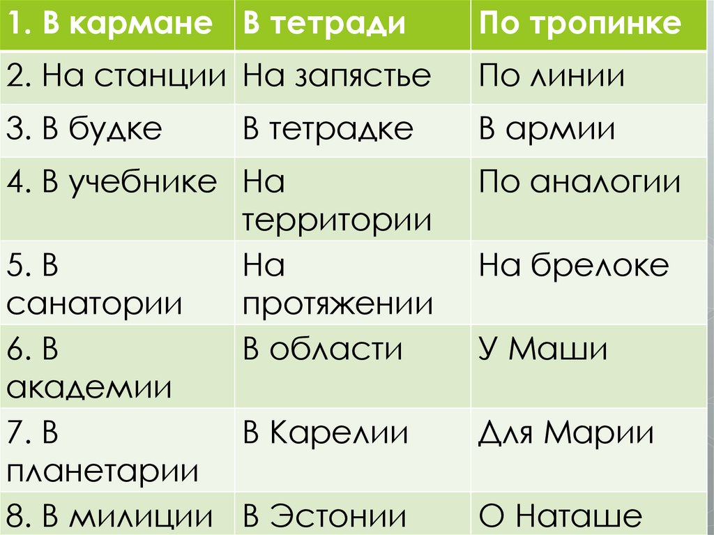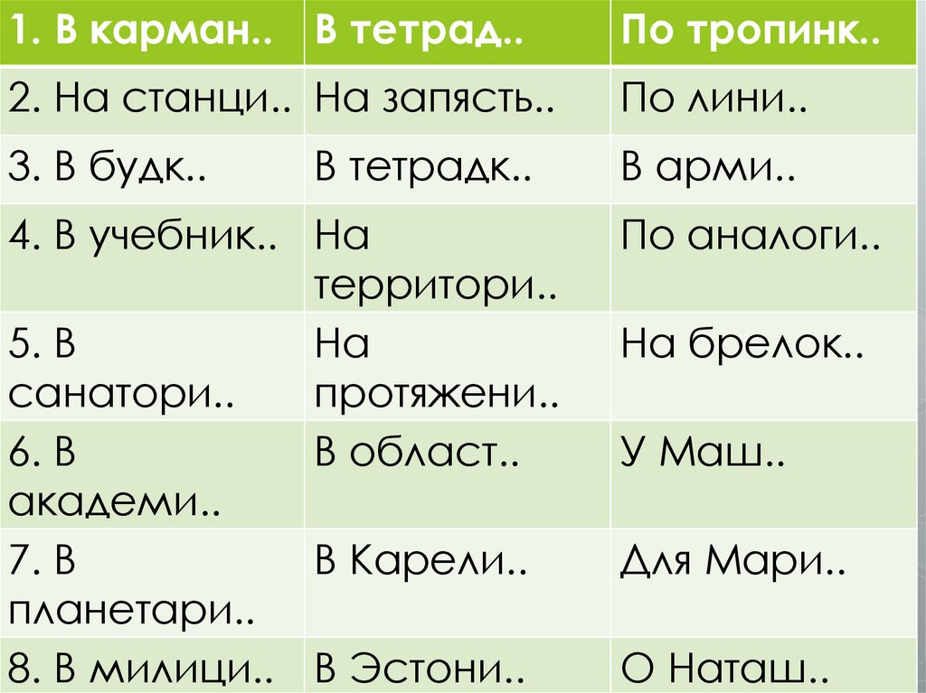 1. В карман.. В тетрад..По тропинк..