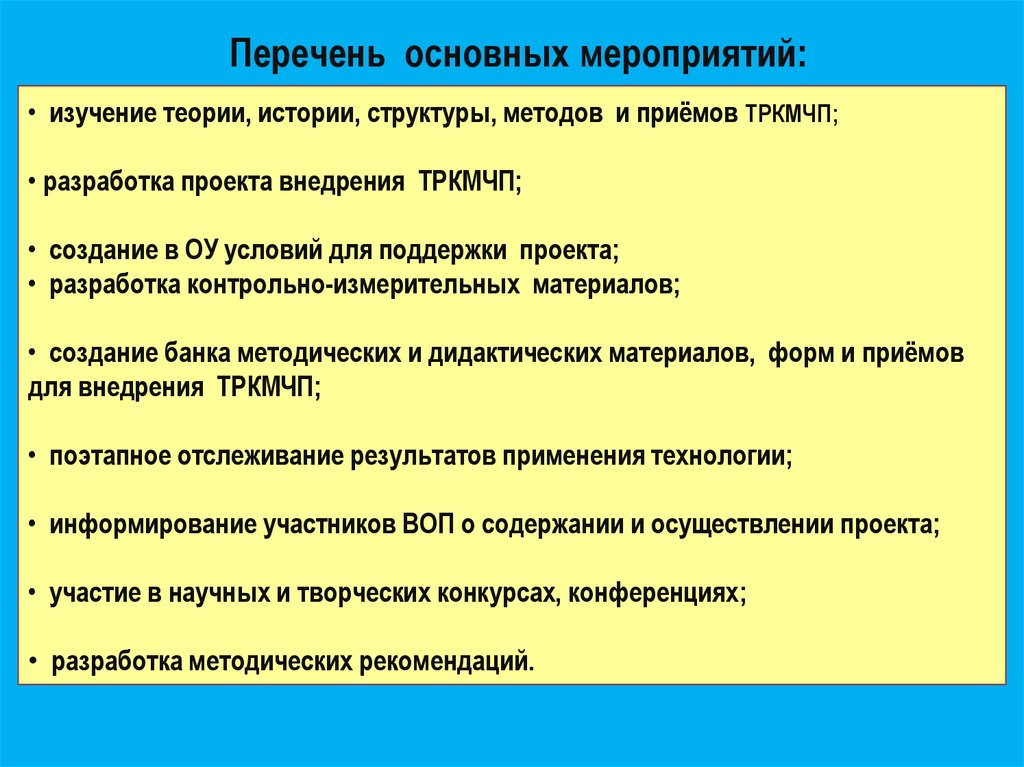 Перечень основных мероприятий:• изучение теории, истории, структуры, методов и приёмов ТРКМЧП;