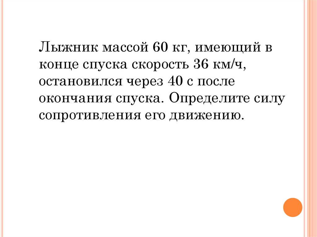 Лыжник массой 60 кг, имеющий вконце спуска скорость 36 км/ч,
