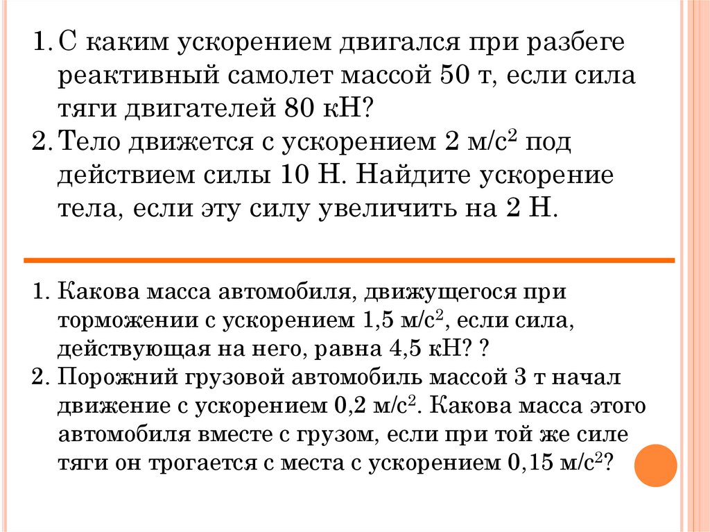 1. С каким ускорением двигался при разбегереактивный самолет массой 50 т, если сила