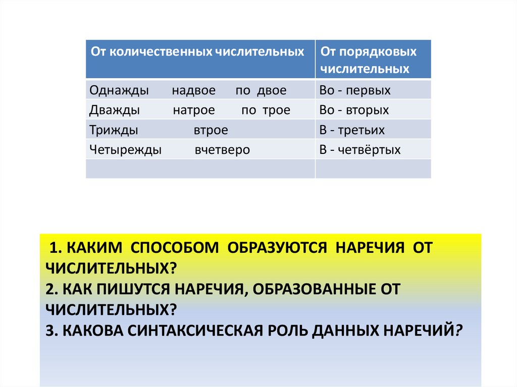 наречий, образованных от числительных.