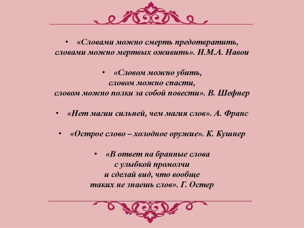 • «Словами можно смерть предотвратить,словами можно мертвых оживить». Н.М.А. Навои