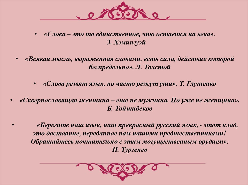 • «Слова – это то единственное, что остается на века».Э. Хэмингуэй
