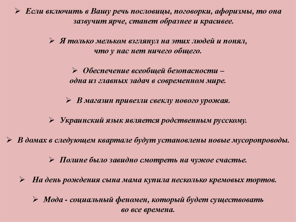 Если включить в Вашу речь пословицы, поговорки, афоризмы, то оназазвучит ярче, станет образнее и красивее.