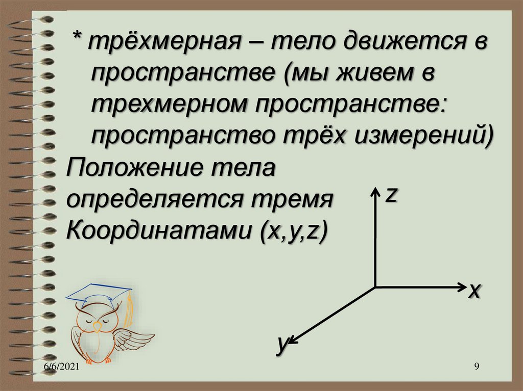 * трёхмерная – тело движется впространстве (мы живем в