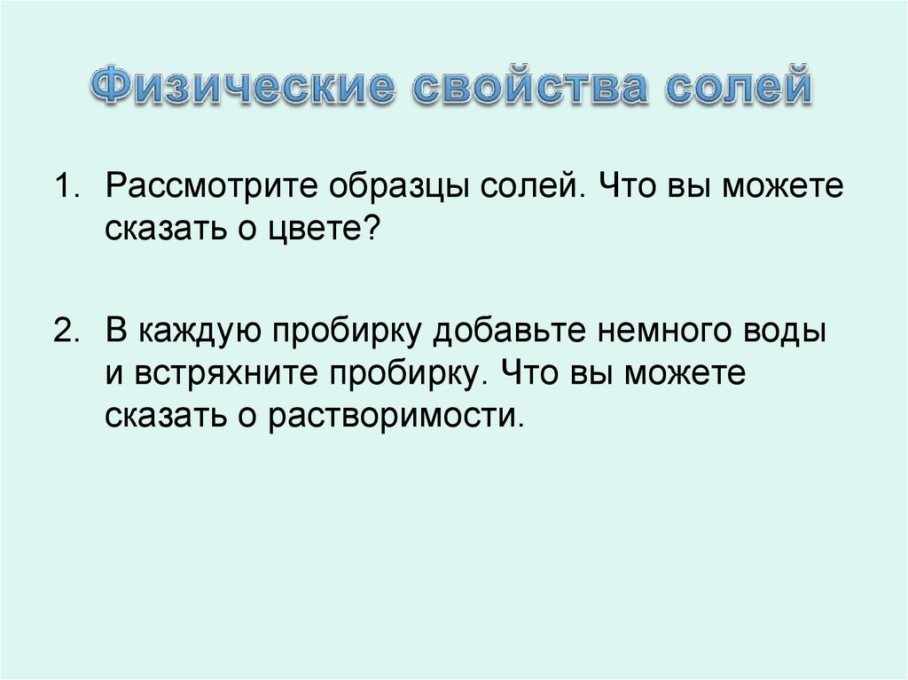 1. Рассмотрите образцы солей. Что вы можетесказать о цвете?