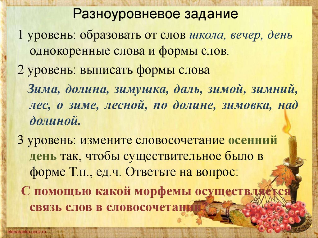 Разноуровневое задание1 уровень: образовать от слов школа, вечер, день