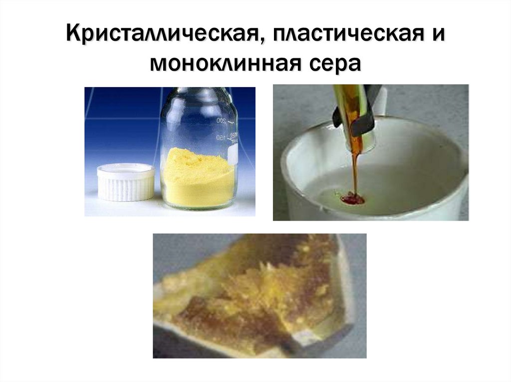 Кристаллическая, пластическая имоноклинная сера