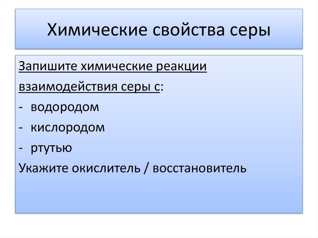 Химические свойства серыЗапишите химические реакции