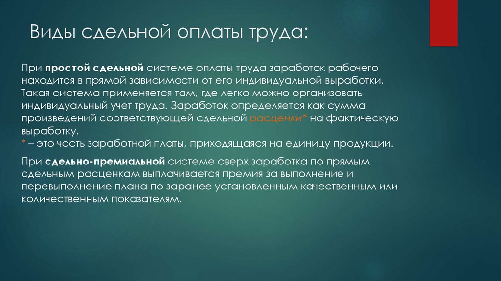Виды сдельной оплаты труда:При простой сдельной системе оплаты труда заработок рабочего