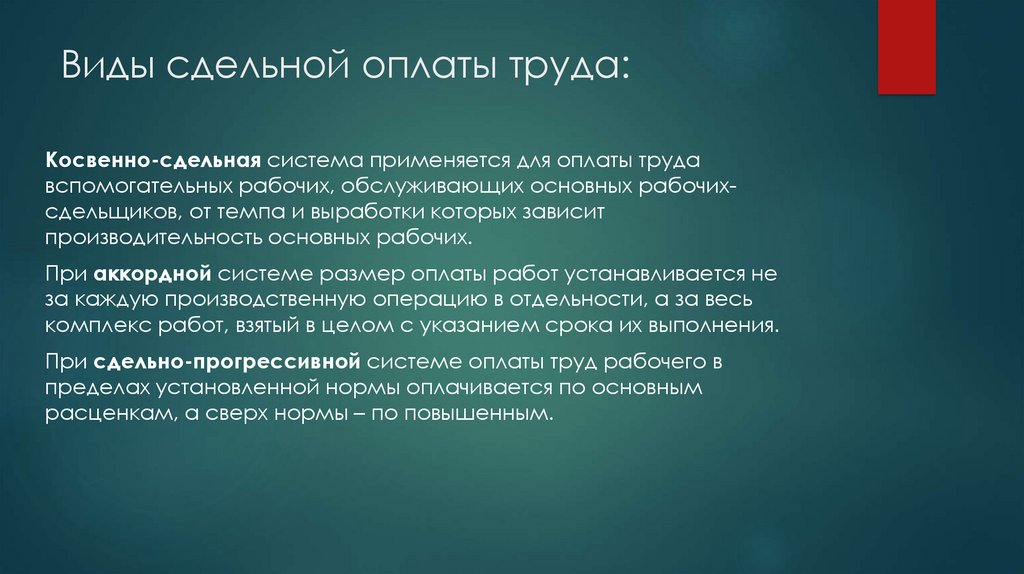 Виды сдельной оплаты труда:Косвенно-сдельная система применяется для оплаты труда