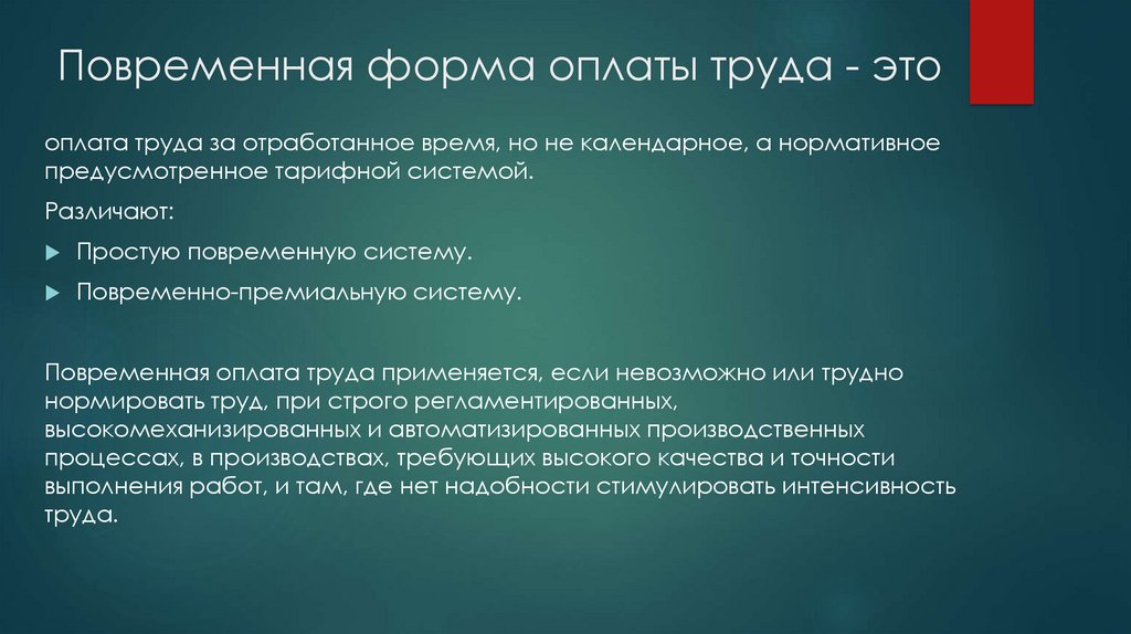 Повременная форма оплаты труда - этооплата труда за отработанное время, но не календарное, а нормативное