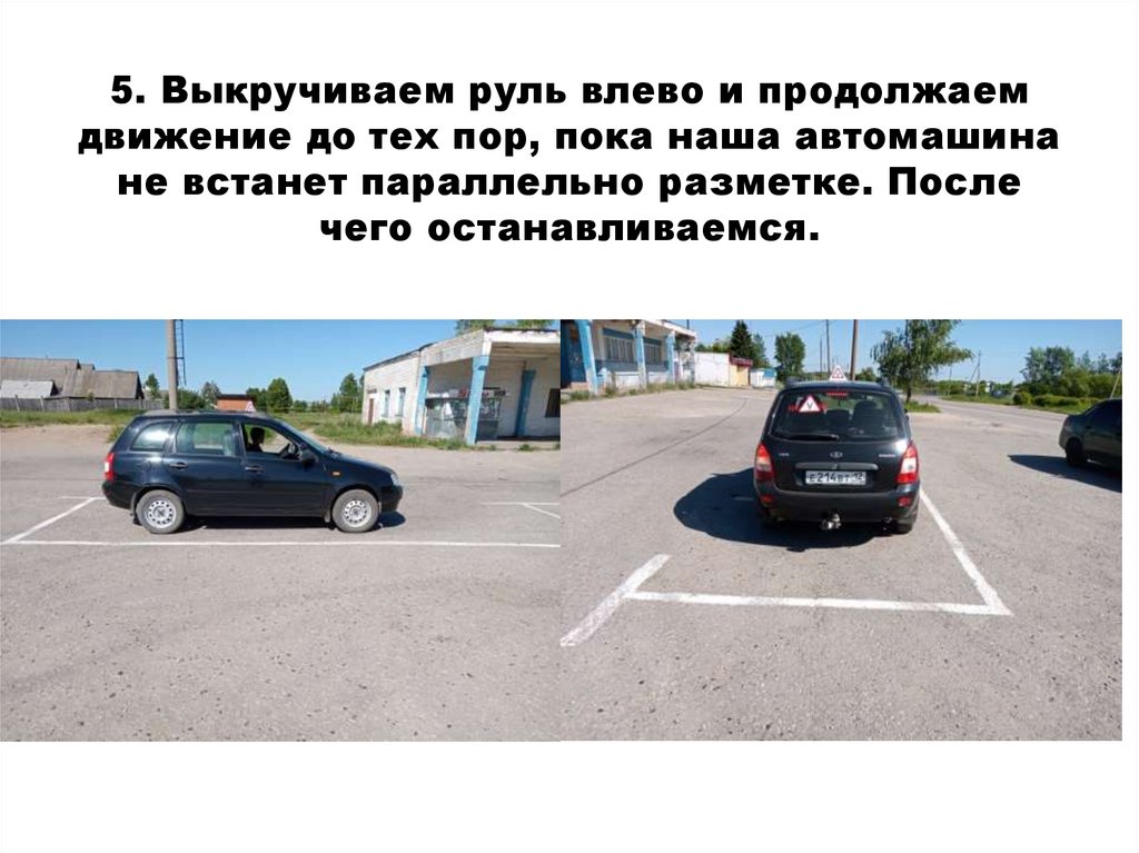 5. Выкручиваем руль влево и продолжаемдвижение до тех пор, пока наша автомашина