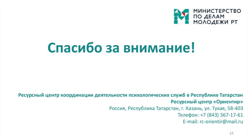 Спасибо за внимание!Ресурсный центр координации деятельности психологических служб в Республике Татарстан