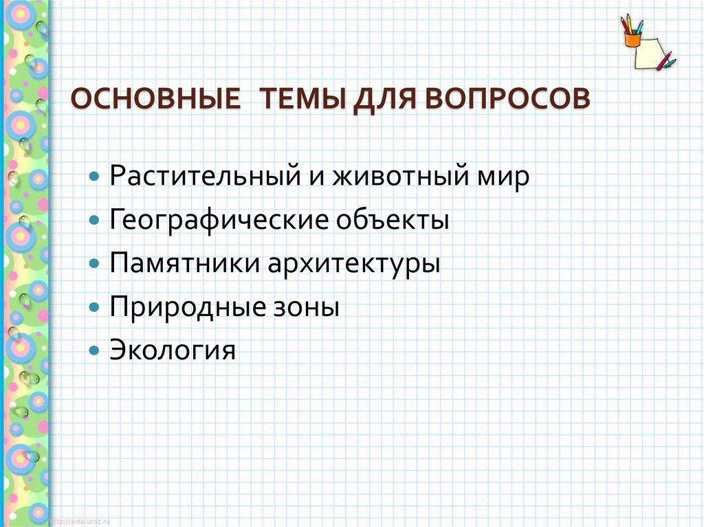 ОСНОВНЫЕ ТЕМЫ ДЛЯ ВОПРОСОВРастительный и животный мир
