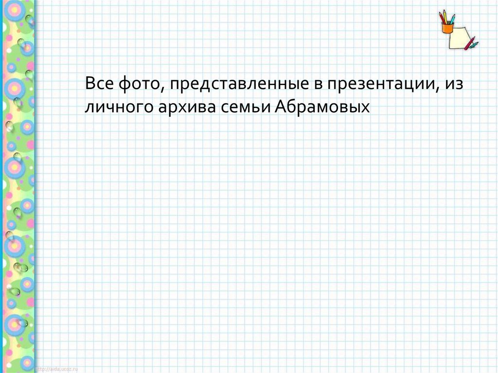 Все фото, представленные в презентации, изличного архива семьи Абрамовых