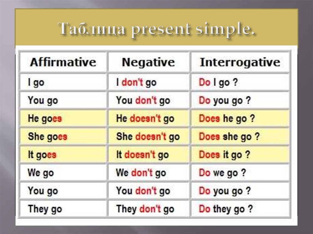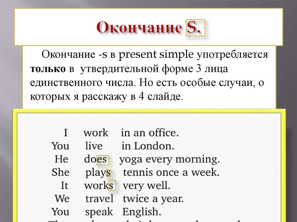 Окончание -s в present simple употребляетсятолько в утвердительной форме 3 лица