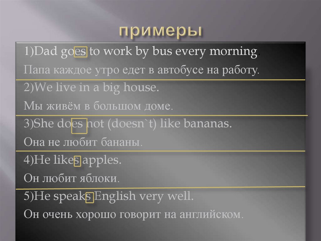 1)Dad goes to work by bus every morning.Папа каждое утро едет в автобусе на работу.