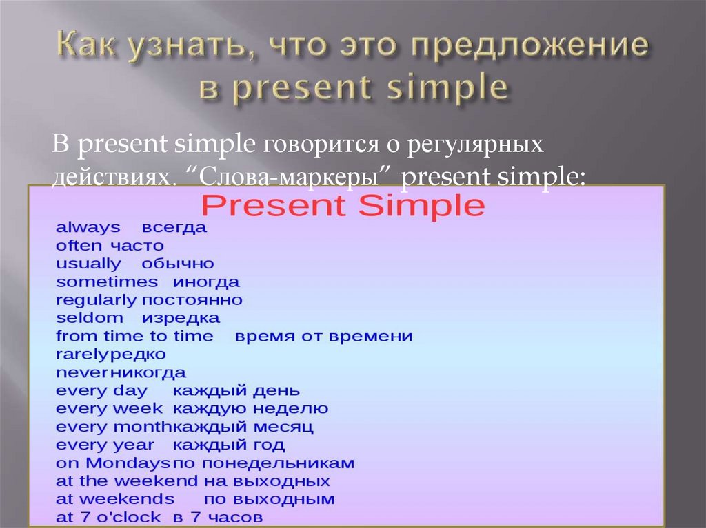 В present simple говорится о регулярныхдействиях. “Слова-маркеры” present simple: