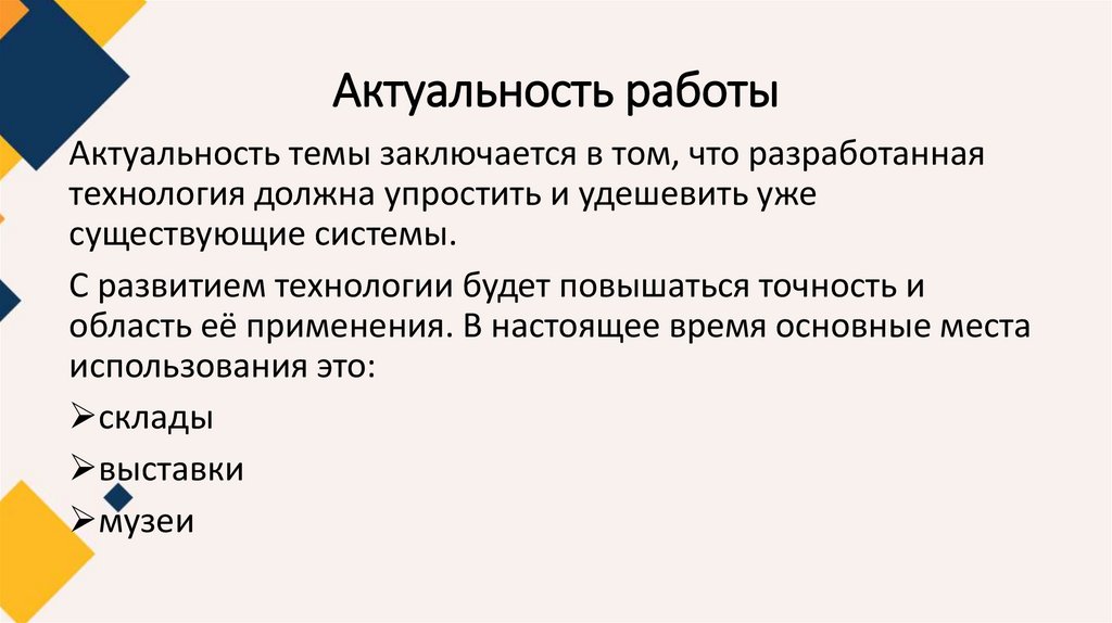 Актуальность работыАктуальность темы заключается в том, что разработанная