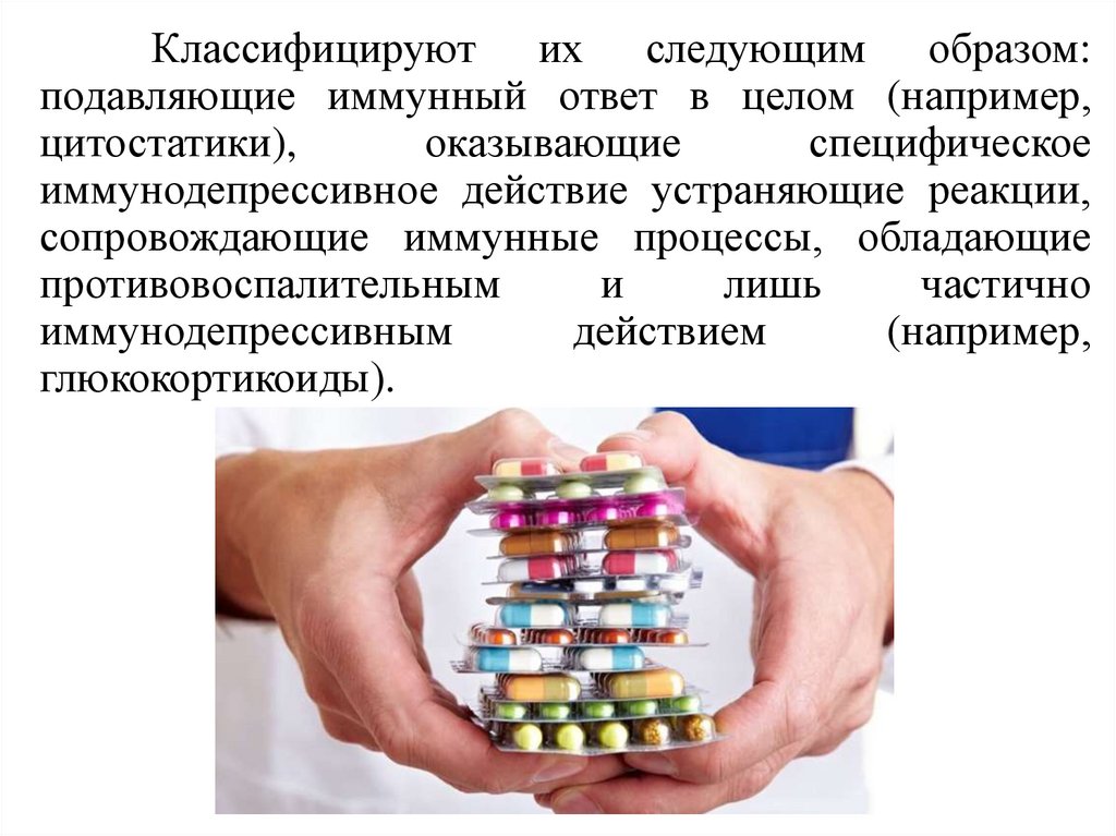 Классифицируют их следующим образом:подавляющие иммунный ответ в целом (например,