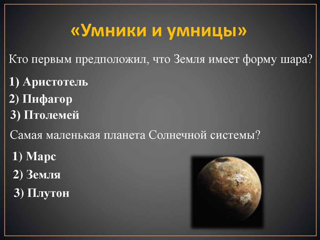 «Умники и умницы»Кто первым предположил, что Земля имеет форму шара?