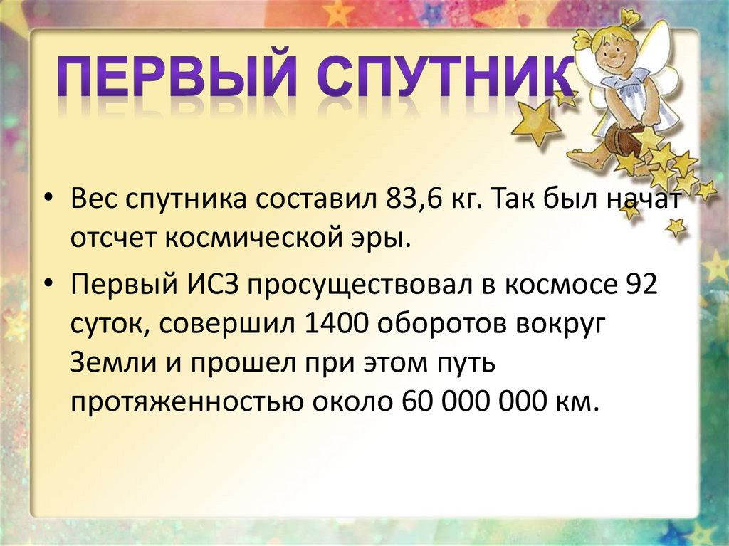 • Вес спутника составил 83,6 кг. Так был начатотсчет космической эры.