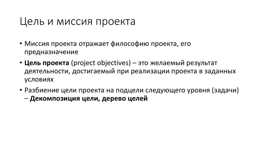 • Цель проекта (project objectives) – это желаемый результат