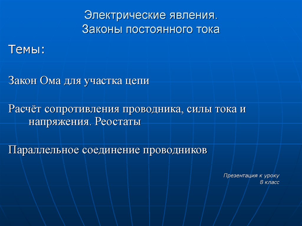 Закон Ома для участка цепи. Электрические явления. Законы постоянного тока