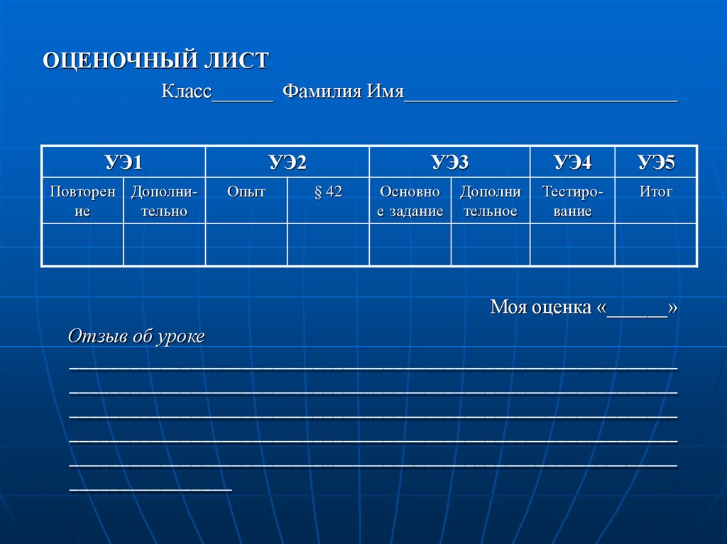 ОЦЕНОЧНЫЙ ЛИСТКласс______ Фамилия Имя___________________________