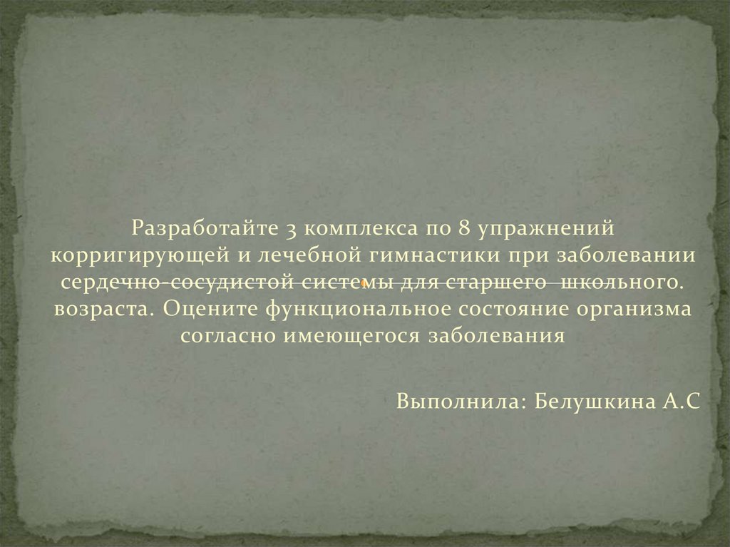 Разработайте 3 комплекса по 8 упражненийкорригирующей и лечебной гимнастики при заболевании