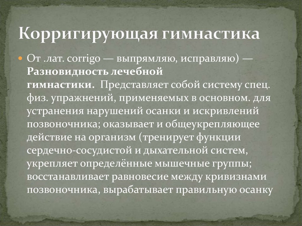 От .лат. corrigo — выпрямляю, исправляю) —Разновидность лечебной