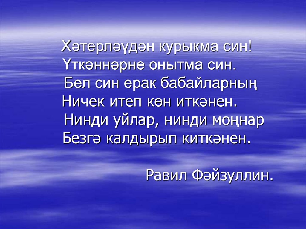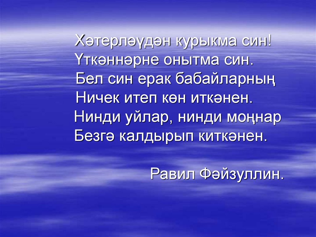 Хәтерләүдән курыкма син! Үткәннәрне онытма син. Бел син ерак бабайларның Ничек итеп көн иткәнен