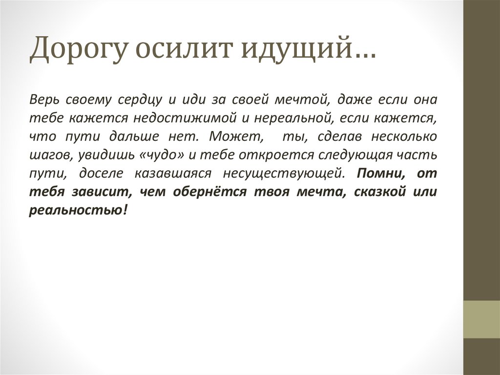 Дорогу осилит идущий…Верь своему сердцу и иди за своей мечтой, даже если она