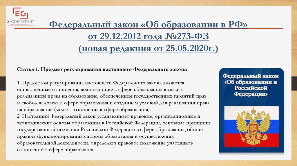 Федеральный закон «Об образовании в РФ» от 29.12.2012 года №273-ФЗ (новая редакция от 25.05.2020г.)