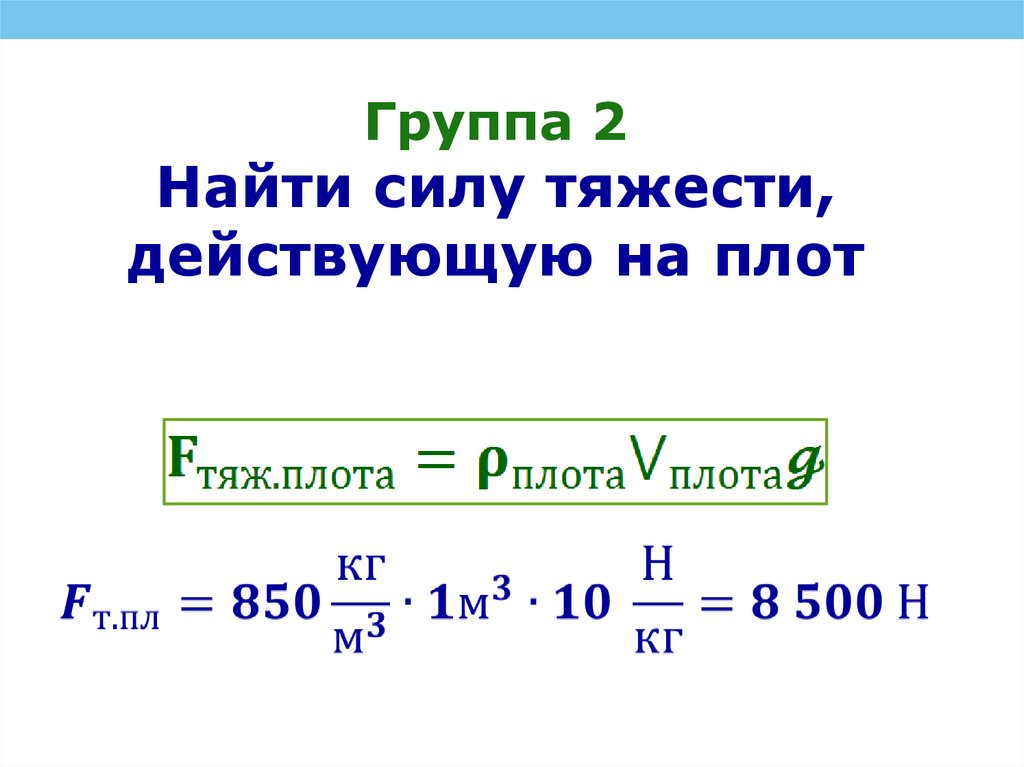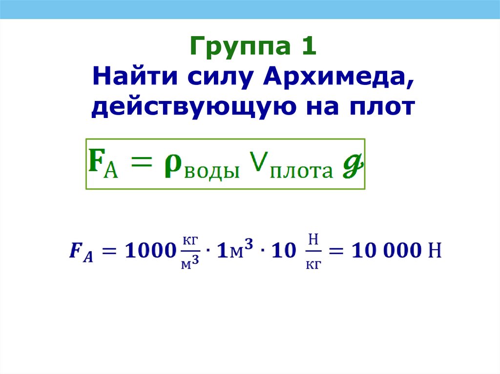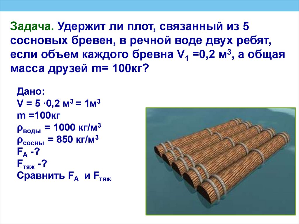 Задача. Удержит ли плот, связанный из 5сосновых бревен, в речной воде двух ребят,