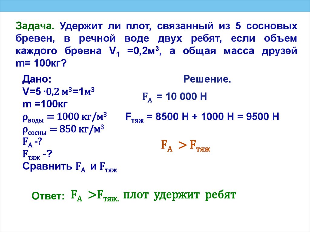 Задача. Удержит ли плот, связанный из 5 сосновыхбревен, в речной воде двух ребят, если объем