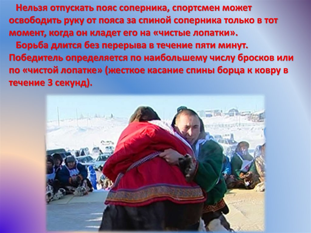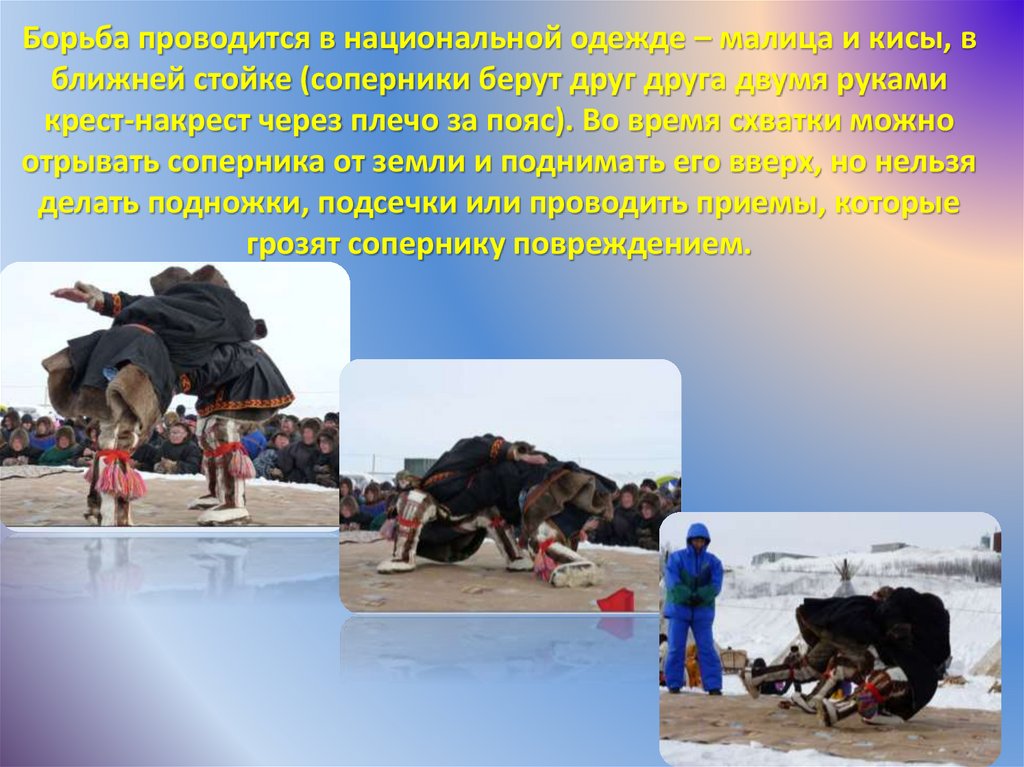 Борьба проводится в национальной одежде – малица и кисы, вближней стойке (соперники берут друг друга двумя руками