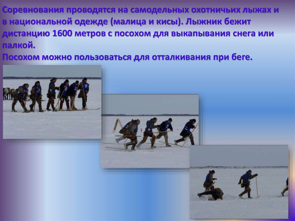 Соревнования проводятся на самодельных охотничьих лыжах ив национальной одежде (малица и кисы). Лыжник бежит