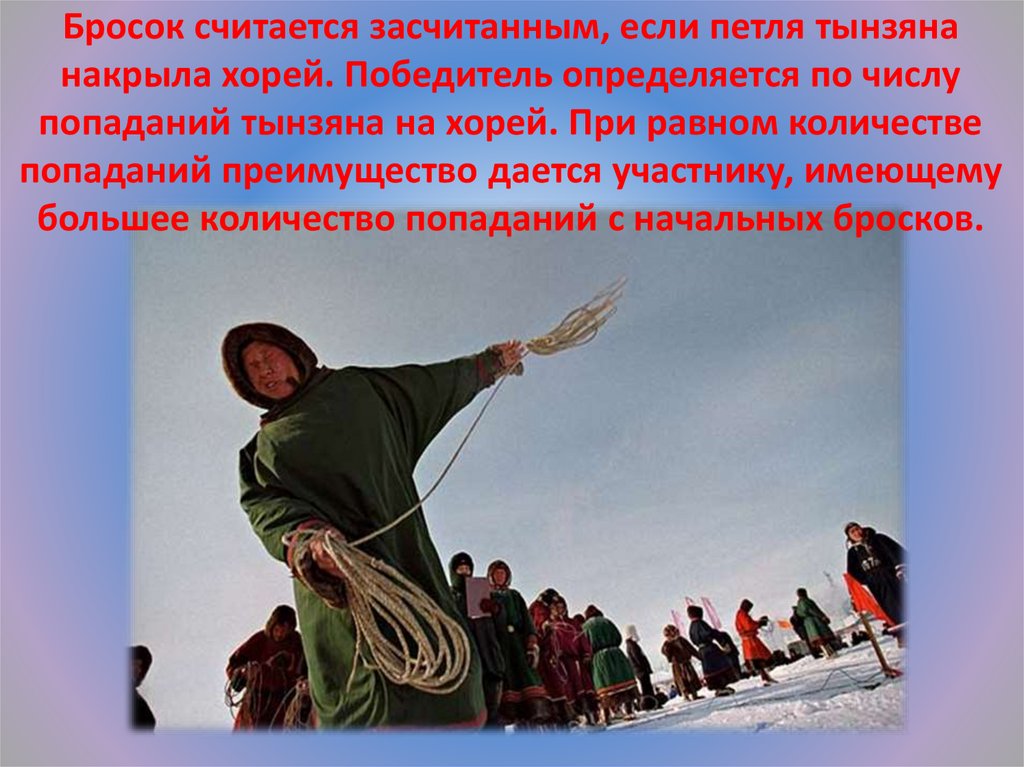 Бросок считается засчитанным, если петля тынзянанакрыла хорей. Победитель определяется по числу