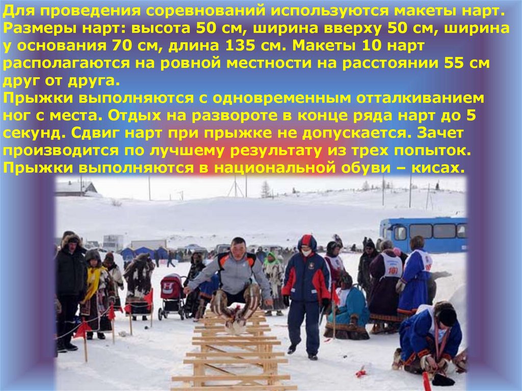 Для проведения соревнований используются макеты нарт.Размеры нарт: высота 50 см, ширина вверху 50 см, ширина