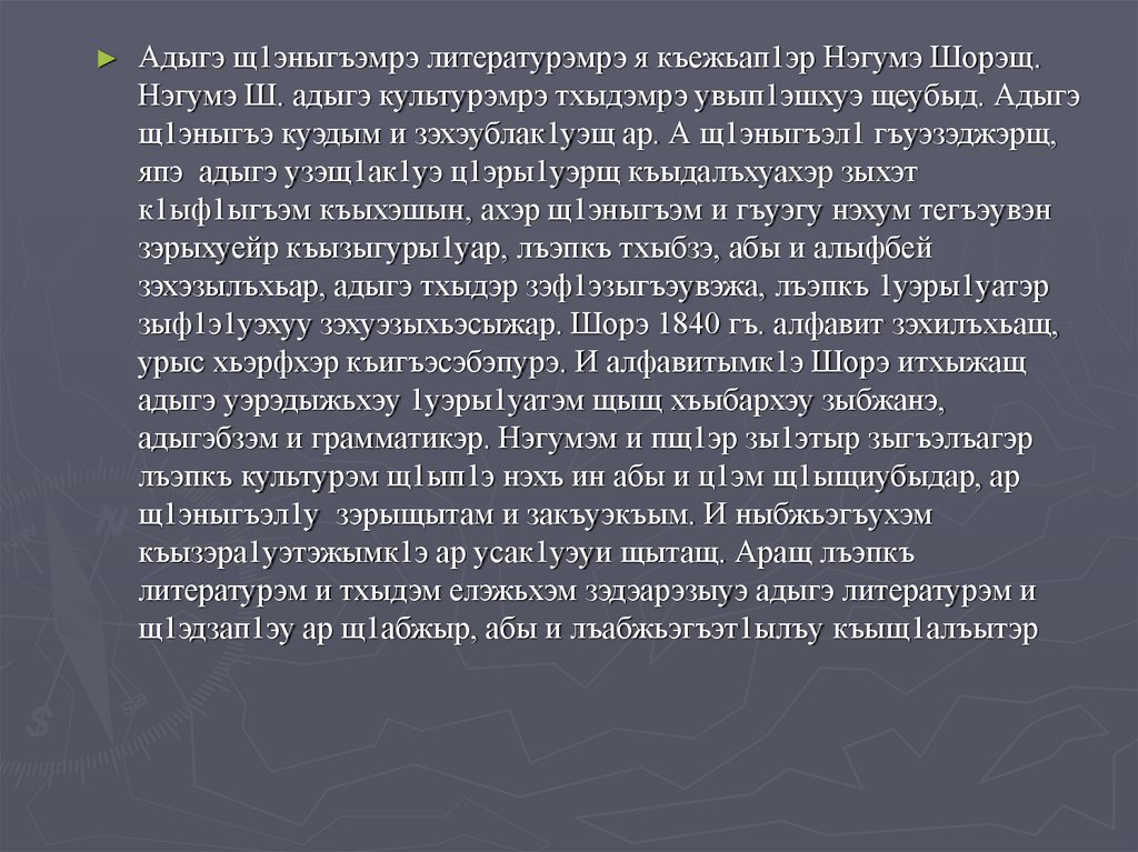 Адыгэ щ1эныгъэмрэ литературэмрэ я къежьап1эр Нэгумэ Шорэщ.