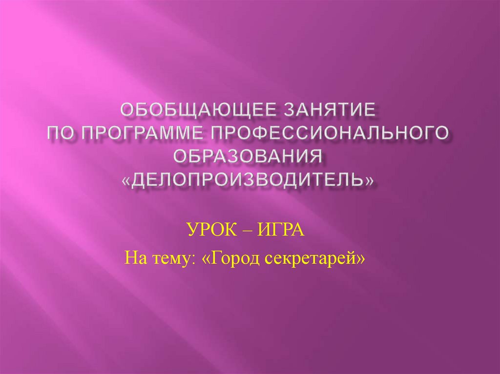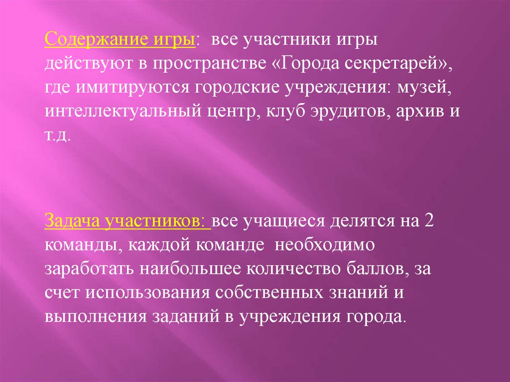 Содержание игры: все участники игрыдействуют в пространстве «Города секретарей»,