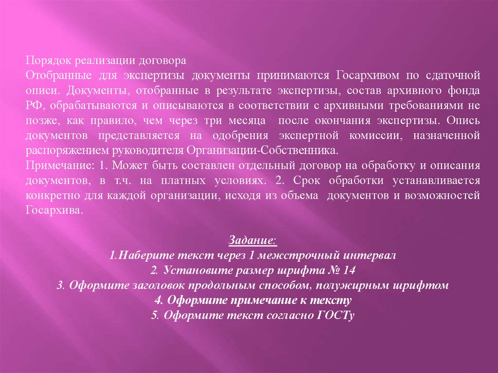 Порядок реализации договораОтобранные для экспертизы документы принимаются Госархивом по сдаточной
